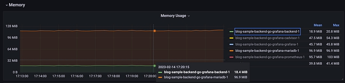 Memory usage is 18.4 MB for the backend and 96.9 for MariaDB, and the curves remain flat.