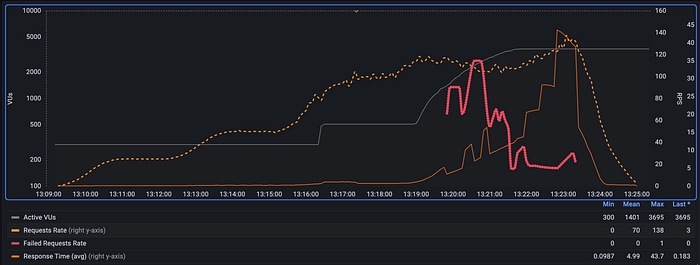 Another thing we can observe is that maximum RPS achieved are around 138, although our goal was to reach 150 RPS. This occurs because latency increases so much that the maximum number of VUs isn’t sufficient to reach specified RPS. Here we could increase the maximum number of VUs in the test, but we should consider that the machine from which the test is launched has sufficient capacity to support it. In a larger system, tests could be launched from a cluster and scale the number of containers. In any case, with the RPS achieved, it’s sufficient for us to see that the system begins to degrade and return calls with errors, although it doesn’t crash. And when traffic returns to normal levels, the system responds again within set thresholds.
