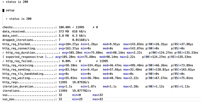 K6 allows defining our SLOs (Service level objectives) directly in the code. For our test, we’ve set that we want the 95th percentile latency to be less than 200ms and the error rate to be less than 1%. If any of the SLOs aren’t met, K6 will indicate it in the results report shown when test execution finishes.