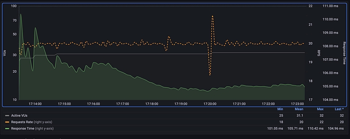 As observed, RPS (orange dashed curve) has been maintained at 20 RPS, as we specified in the test. The Average Response Time (green curve), while it’s true that at first glance it shows greater change at the beginning then becomes more or less constant, the difference between maximum and minimum average value is less than 10%, which is in line with expectations. In general, small variations in measurements are expected since there are many factors that can affect times, from system load at the time of the test to network status.