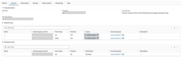2 — In the Security Group, we add 2 inbound traffic rules to ports 22 (SSH) and 9494 (port where the API is exposed) from our home IP or the machine where we’ll launch the K6 tests.
