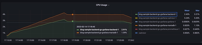 If we go to the Cadvisor exporter grafana dashboard, we find resource usage metrics. In the first graph, we can observe CPU consumption for different services. As seen, CPU usage is very low for both services, with a small increase at the beginning of the test, then it stabilizes