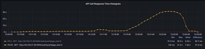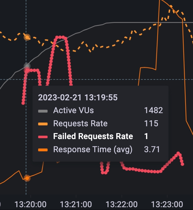 If we zoom in on the API Call Response Time graph, we see the moment when p95 latency exceeds the 200ms threshold (red line). If we observe the RPS value in the other graph at that time instant, we see it’s around 22 RPS. This means that with current infrastructure, we shouldn’t exceed this limit if we want to meet the latency SLO.