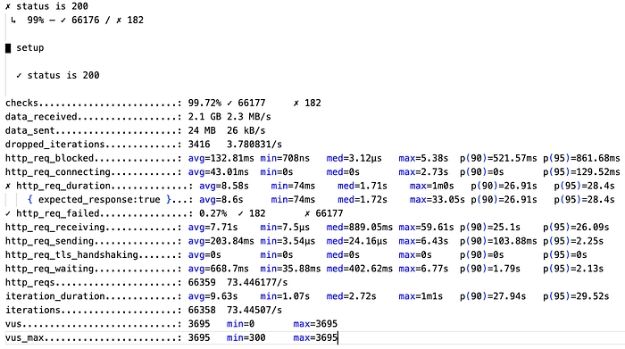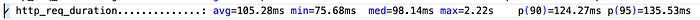 ‘http_req_duration’ shows us call latency (measured from the K6 client; note that latency will be highly proportional to the distance between the machine where the K6 client launching the test runs and the machine where the system being tested runs). The p(095) or 95th percentile is 135.53ms which means 95% of calls have completed in at most that time. This is below the SLO we set of p95<200ms. On the other hand, the average latency is 105.28ms.