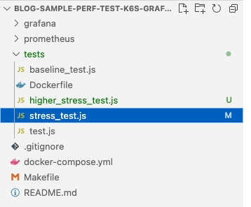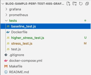 - A container with K6 that executes the test specified in testfile.js, and listens for changes in that file to relaunch it every time it’s saved
